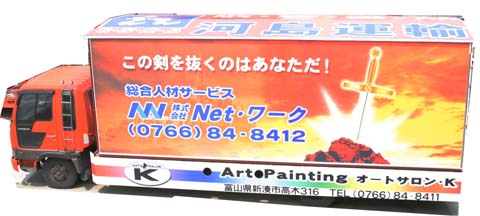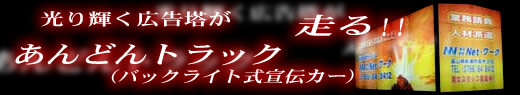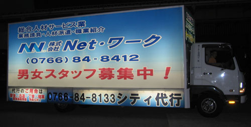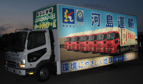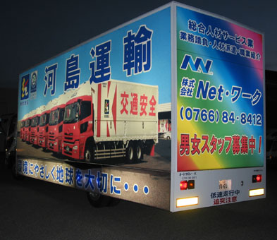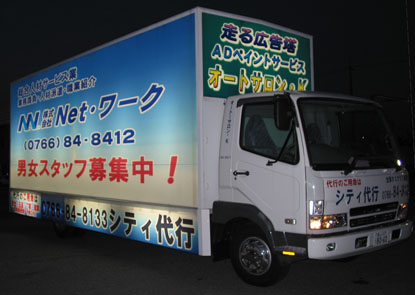 トラックの荷台部分を大型スクリーンとしてペインティングすることで 「走る広告塔」を実現! この荷台部分は、光透過性マットを使用しており、 夜間はシート裏に設置したライトを点灯することにより スクリーンが浮かび上がってくるバックライト方式をとっています。 大きいから遠くの方からでも視認性抜群!! 夜間はライトアップにより更に視認性アップ、注目度抜群!! 音声装置も備えており、光と音で表現!! 特定時間に特定場所を重点的に巡回することで, 広告効果抜群!!